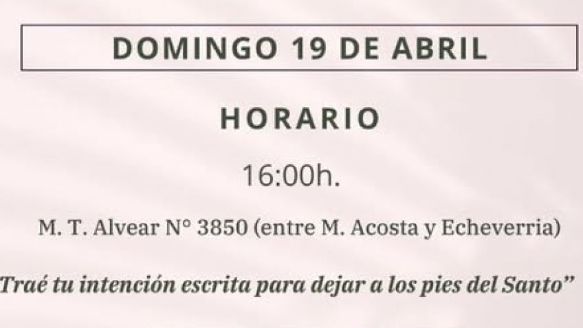 Hoy, domingo 19 de abril, a las 16:00 en Marcelo T. Alvear 3850 (entre Mariano Acosta y Echeverría) Trae tu intención escrita para dejar a los pies del Santo.