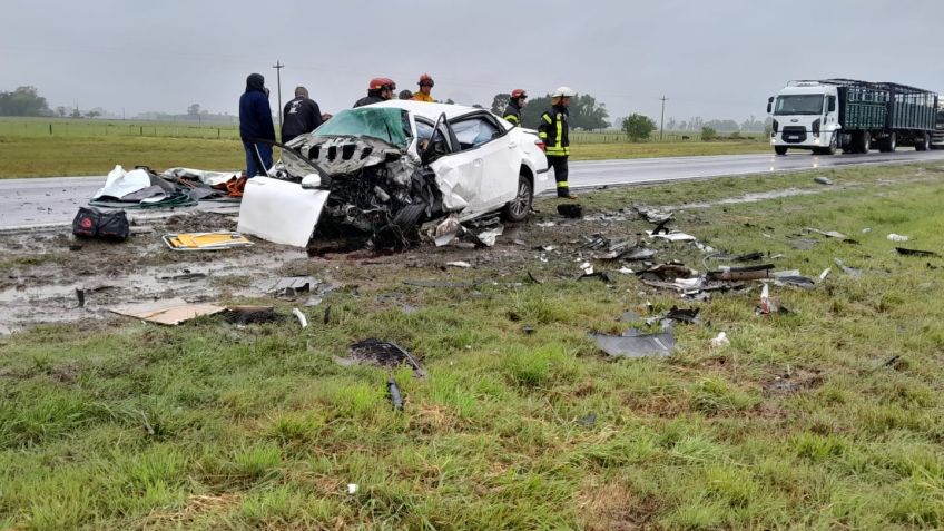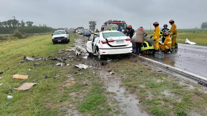 La Comisaria de Saladillo informa que ayer, alrededor de las 12:30 aproximadamente a requerimiento de emergencias policiales, personal del Destacamento del Carril es comisionado a la Ruta Nacional 205 a la altura del kilómetro 161 en virtud a un hecho de tránsito, y a su arribo se constata que instantes antes un automóvil marca Toyota con dominio colocado AD586SE conducido por un hombre y su acompañante una mujer (ambos oriundos La Matanza) colisionan de manera frontal con un automóvil BMW dominio colocado MKN133 conducido por un hombre (oriundo de Olavarría) y una mujer acompañante (oriunda de Río Gallegos). Dada a la magnitud del impacto ambos conductores perdieron la vida en el lugar del siniestro, no así sus acompañantes quienes fueron derivadas al hospital de Saladillo por poseer distintas heridas de consideración. Intervino Policía Científica a fin de determinar mecánica del accidente, dejando en claro que al momento se encontraba lloviendo. Interviene la UFIJ 2 a cargo del doctor Berlingieri del Departamento Judicial de La Plata.