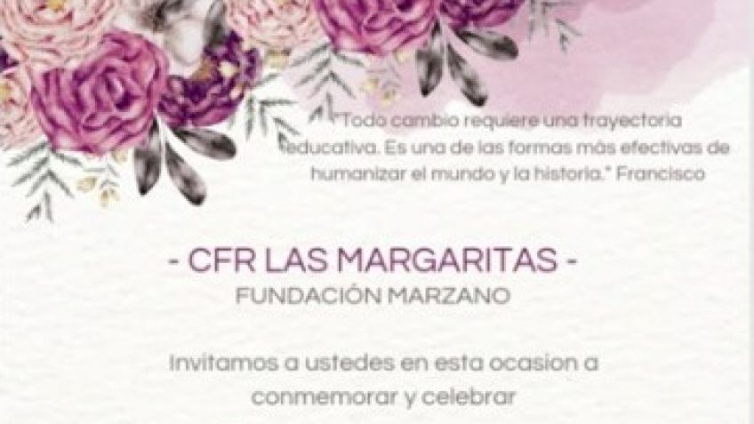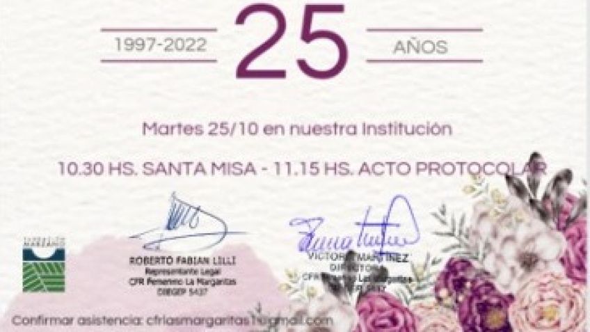 Invitamos a ustedes al acto de los 25 años del CFR Las Margaritas, que se realizará el martes 25 de octubre en la Institución a partir de las 10:30 con la misa de Acción de gracias y a las 11:15 el acto protocolar. El Equipo Directivo.