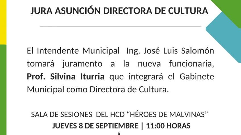 El Intendente Municipal Ing. José Luis Salomón tomará juramento a la nueva funcionaria, Prof. Silvina Iturria que integrará el Gabinete Municipal como Directora de Cultura.