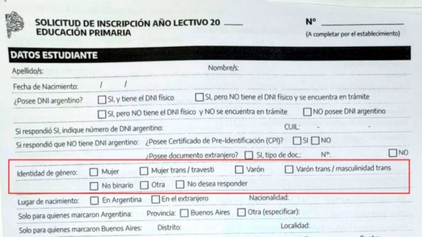 El Gobierno bonaerense introdujo una modificación en las fichas de inscripción que deben completar las familias para anotar a sus hijos en los jardines, primarias y secundarias para el ciclo 2023. El casillero de "género" ofrece más posibilidades que la división tradicional entre "varón" y "mujer" para incluir "Mujer trans/travesti", "Varón", "Varón trans/masculinidad trans", "No binario", "Otra" y "No desea responder".
