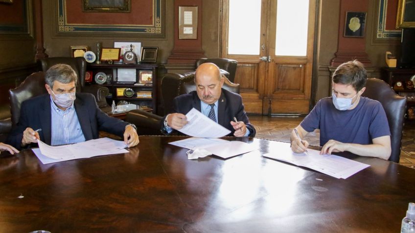 El ministro de Producción, Ciencia e Innovación Tecnológica de la provincia de Buenos Aires, Augusto Costa, junto al titular de empresa YPF- Tecnología (YTEC), Roberto Salvarezza y el presidente de la Universidad Nacional de La Plata (UNLP), Fernando Tauber, firmaron hoy un convenio de cooperación y asistencia para impulsar becas y espacios de formación en la fabricación de celdas y baterías de litio.