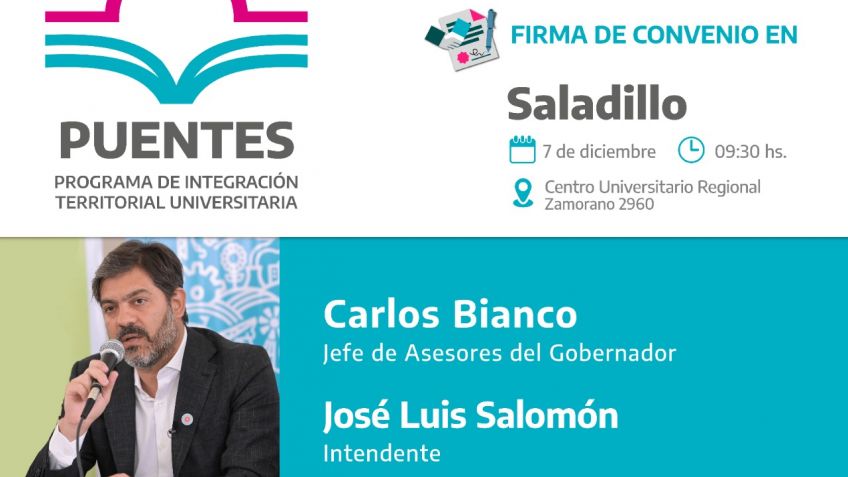 El miércoles 7/12 el Jefe de Asesores del Gobernador, Carlos Bianco, visitará Saladillo donde encabezará la firma del convenio de adhesión del municipio al programa PUENTES junto al intendente José Luis Salomón. Finalizado el acto se realizará una rueda de prensa. en el Centro Universitario Regional Zamorano, a las 10:00. PUENTES es una iniciativa del Consejo Provincial de Coordinación Universitaria a cargo de Juan Brardinelli y tiene como objetivo fomentar la educación universitaria en toda la provincia de Buenos Aires a través de la apertura de carreras orientadas a cubrir las necesidades de desarrollo científico y productivo de cada territorio.