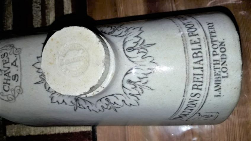 Abajo, en letras negras se ve la marca de la empresa fabricante: "Lambeth Pottery. London", compañía de prestigio que aún daba mayor brillo y distinción a la empresa que la obsequiaba.