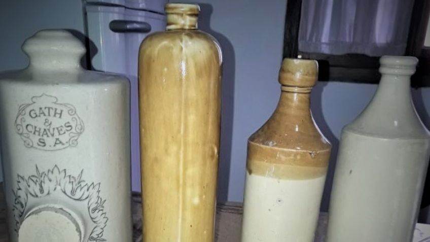 La botella era de regalo para esos clientes: blanca y esmaltada, con el sello de la empresa filigramado y finamente decorado, con el brillo y la elegancia de Gath y Cháves y la cerámica inglesa. El tapón con sello dice: "Doulton Lambeth", realmente, una botellita de lujo que se rellenaba con agua caliente y no con arena como hacían en el campo.