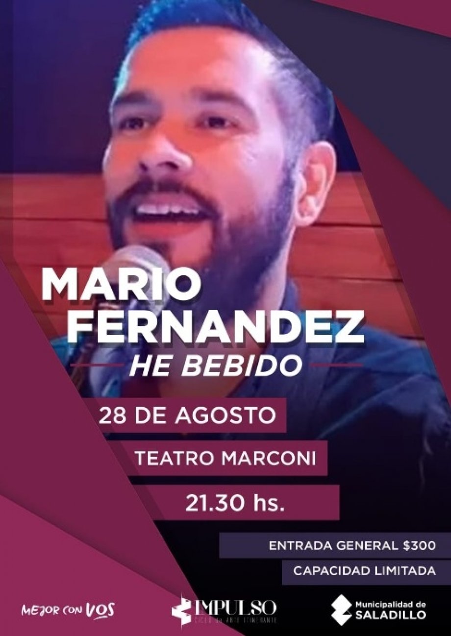 El sábado 28 de agosto se presenta en el Teatro Marconi, Mario Fernández con su trabajo "He bebido". Será a las 21:30 y el precio de la entrada es de 300 pesos. Capacidad limitada