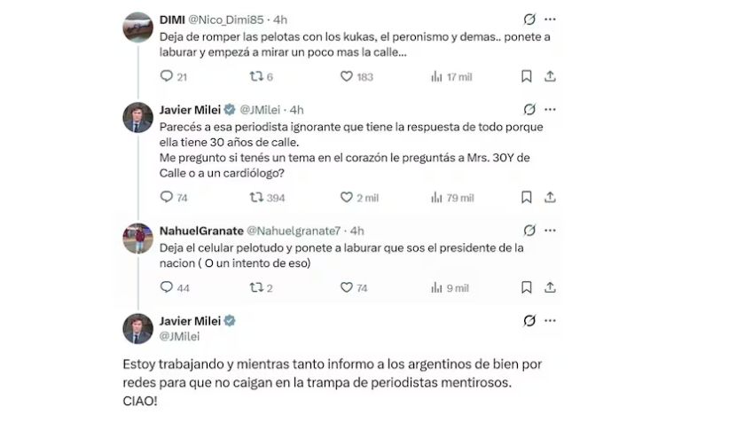 En medio de los escándalos que acorralan a su gobierno, el presidente Javier Milei dedicó su noche y madrugada a responder comentarios en la red social X, con un tono agresivo hacia los que le contestaban.