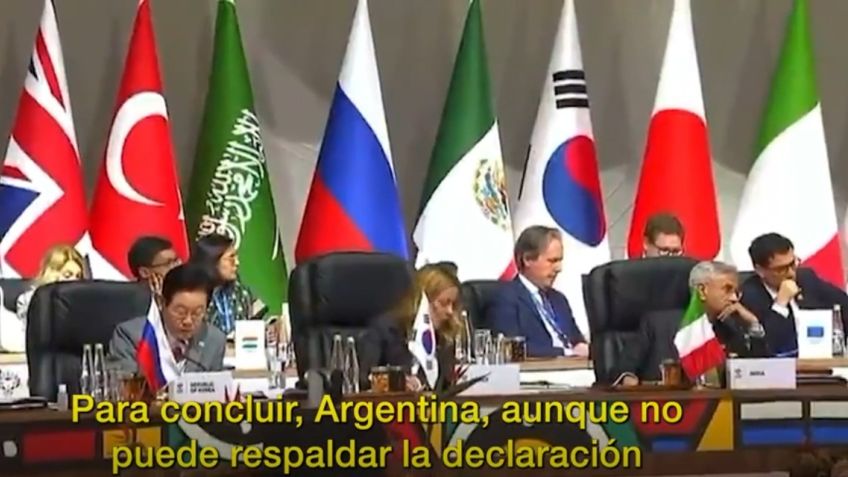 Más temprano, el Gobierno de Javier Milei informó que había decidido no respaldar el documento final presentado en la Cumbre de Líderes del G20 en Johannesburgo, alegando "diferencias sustantivas" en las consideraciones geopolíticas de la declaración y una consecuente quiebra a "las reglas del consenso que rigen el funcionamiento" de la cumbre.