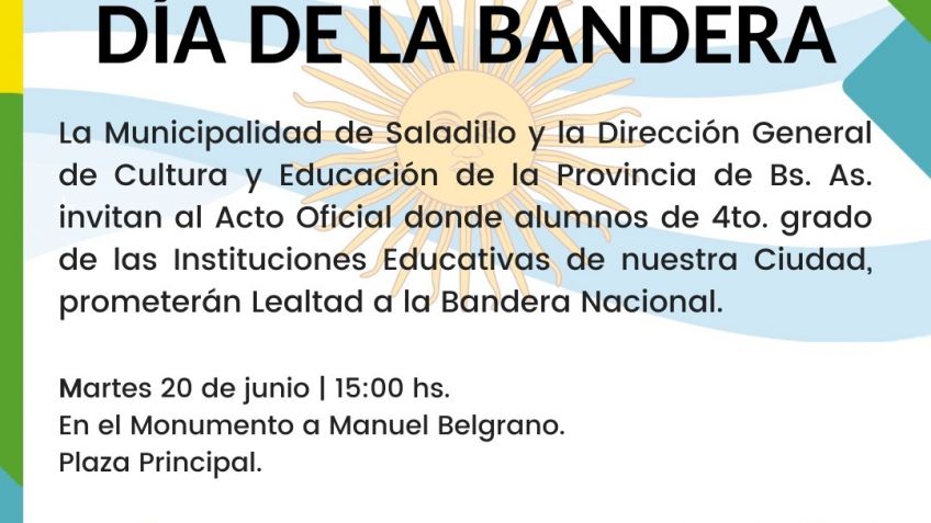 La Municipalidad de Saladillo y la Dirección General de Cultura y Educación de la Provincia de Buenos Aires invitan al acto oficial donde alumnos de 4° grado de las Instituciones Educativas nuestra ciudad, realizará la Promesa de Lealtad a la Bandera Nacional.