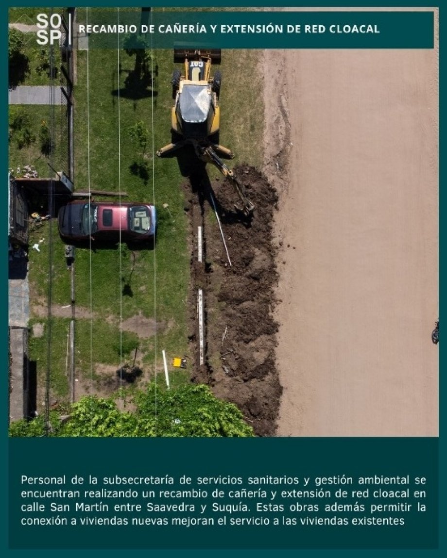 Personal de la subsecretaría de servicios sanitarios y gestión ambiental se encuentran realizando un recambio de cañería y extensión de red cloacal en calle San Martín entre Saavedra y Suquía. Estas obras además permitir la conexión a viviendas nuevas mejoran el servicio a las viviendas existentes