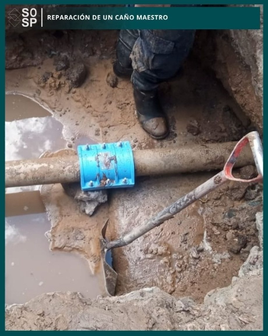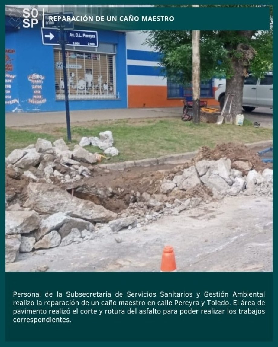 Personal de la Subsecretaría de Servicios Sanitarios y Gestión Ambiental realizo la reparación de un caño maestro en calle Pereyra y Toledo. El área de pavimento realizó el corte y rotura del asfalto para poder realizar los trabajos correspondientes.
