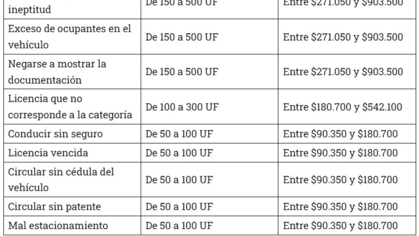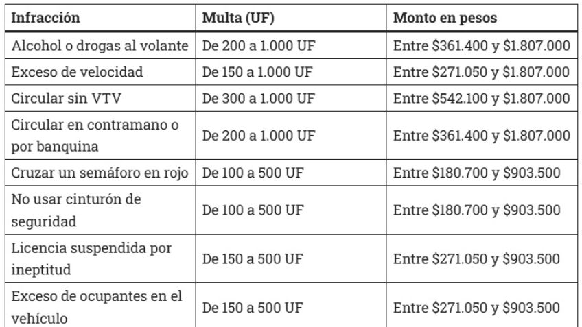 De este modo, cada infracción prevista en el Código de Tránsito provincial -cuyas sanciones se expresan en rangos mínimos y máximos de UF- se traduce automáticamente a montos en pesos que, en los casos más graves, superan ampliamente el millón y medio.