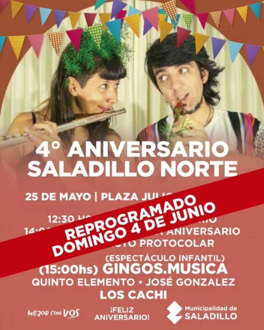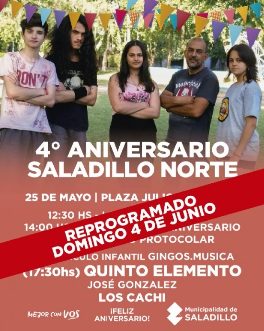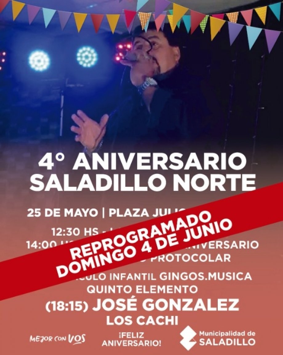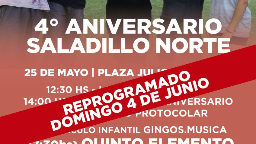 La Municipalidad de Saladillo informa que, por razones climáticas, se posponen las actividades programadas con motivo de los festejos del 4° Aniversario de Saladillo Norte, las actividades programadas se realizarán el domingo 4 de junio.