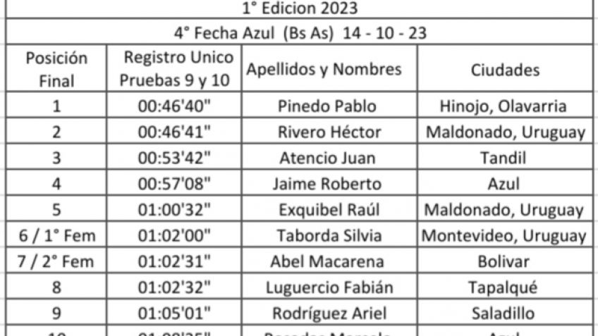 El ganador absoluto del evento fue el representante de la localidad de Hinojo partido de Olavarría Pablo Pinedo, ubicándose en segundo lugar el atleta Héctor Rivero representante del vecino país Uruguay, escalando al tercer lugar del podio el atleta Juan Atencio de la Ciudad de Tandil. En la rama Femenina el triunfo se lo llevó Silvia Taborda de Uruguay, seguida en segundo lugar por la atleta Abel