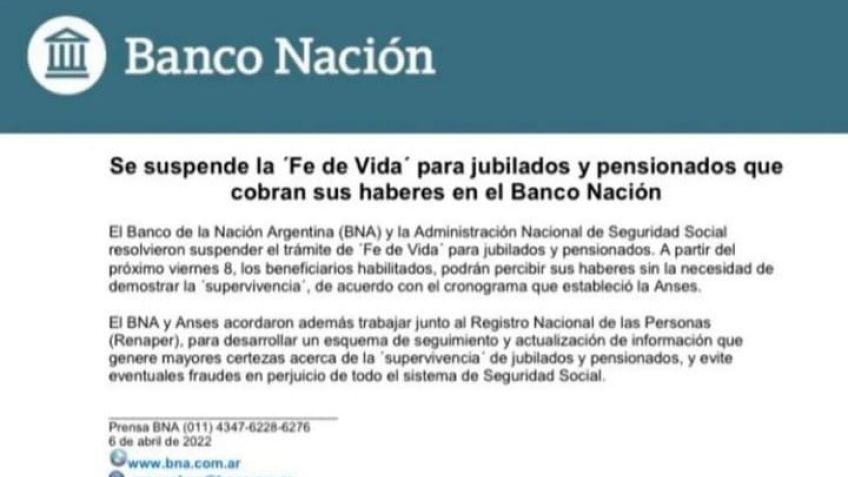 Se suspende la "Supervivencia" para jubilados y pensionados que cobran en Banco Nación y desde el viernes 8 cobrarán sus haberes normalmente.
