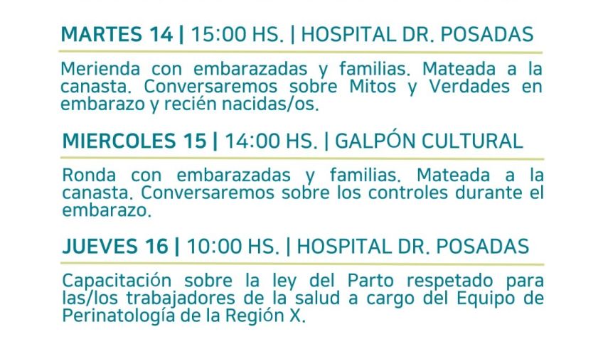 10:00 hs: Capacitación sobre la Ley del Parto Respetado para los/las trabajadores de la salud, a cargo del Equipo de PerinatologÃa de la Región X.