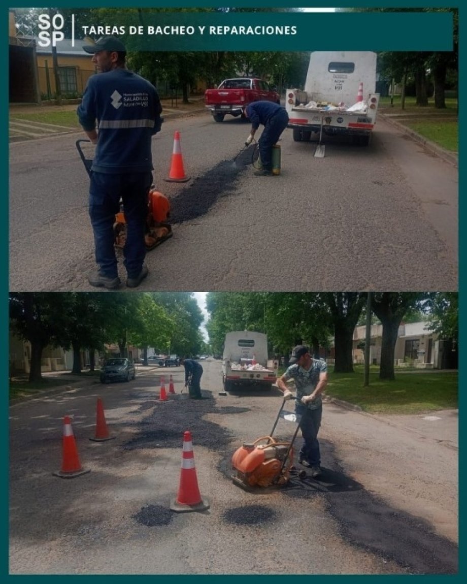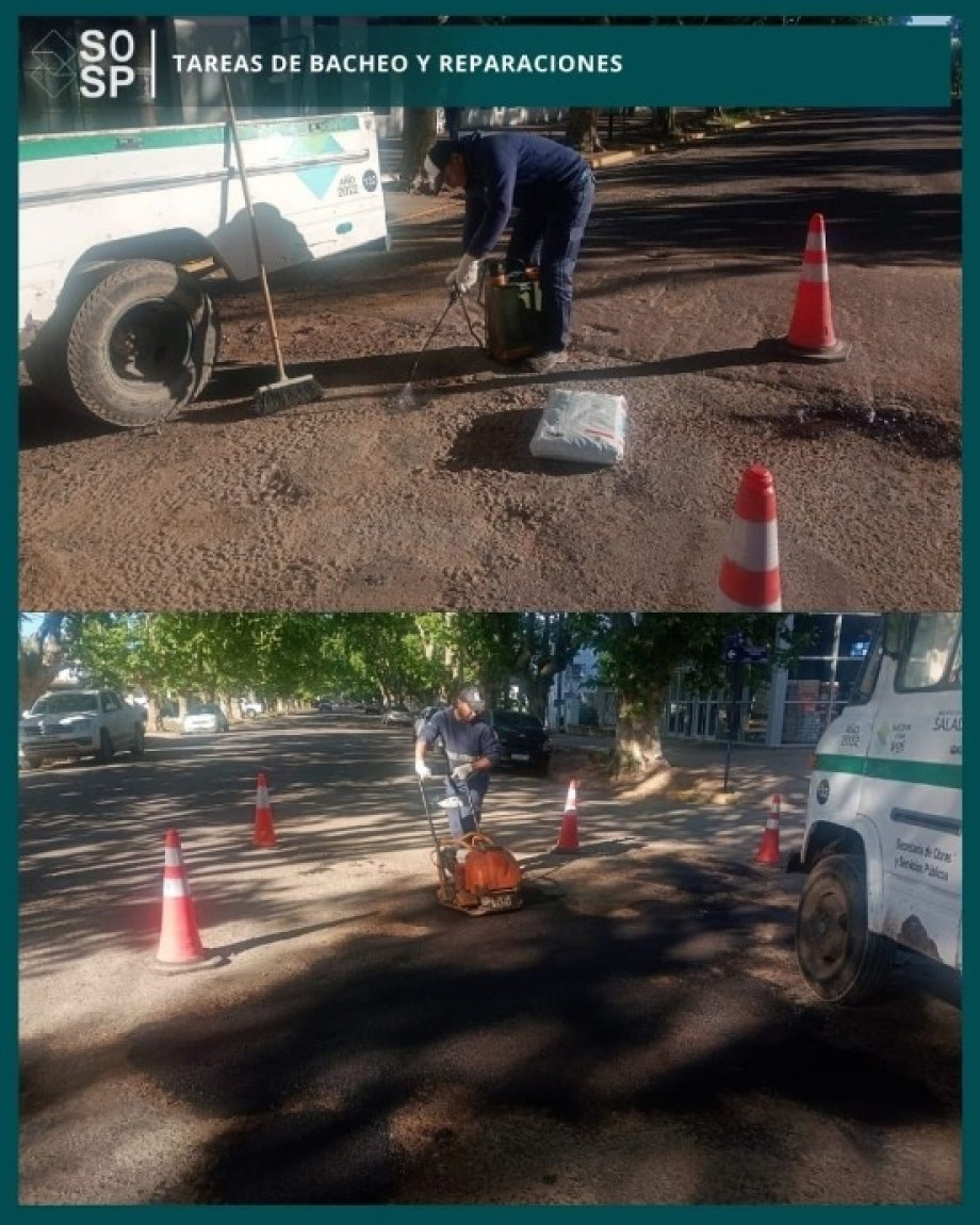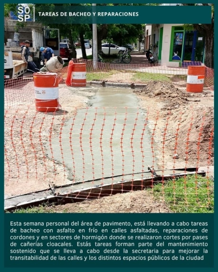 Esta semana personal del área de pavimento, está llevando a cabo tareas de bacheo con asfalto en frío en calles asfaltadas, reparaciones de cordones y en sectores de hormigón donde se realizaron cortes por pases de cañerías cloacales. Estás tareas forman parte del mantenimiento sostenido que se lleva a cabo desde la secretaria para mejorar la transitabilidad de las calles y los distintos espacios públicos de la ciudad