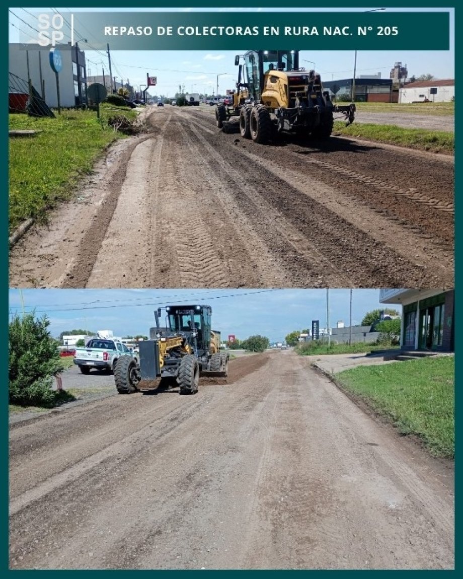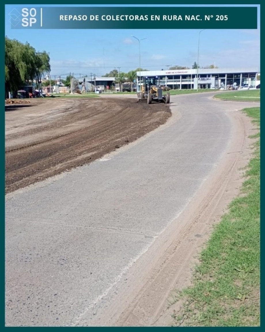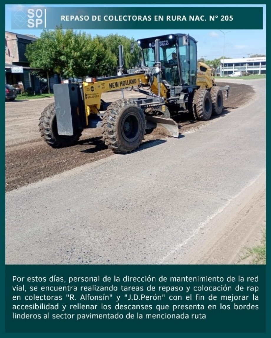 Por estos días, personal de la dirección de mantenimiento de la red vial, se encuentra realizando tareas de repaso y colocación de rap en colectoras "R. Alfonsín" y "J. D. Perón" con el fin de mejorar la accesibilidad y rellenar los descanses que presenta en los bordes linderos al sector pavimentado de la mencionada ruta.