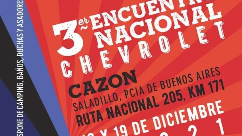 Se realizará en la localidad de Cazón el Tercer encuentro nacional de Chevrolet. Será el 18 y el 19 de diciembre. El sábado todo el día, los autos empiezan a llegar desde la mañana y el domingo será hasta las 18:00. Música, food truck de comida y bebidas. El teléfono de contacto es el 2345-68-4325.
