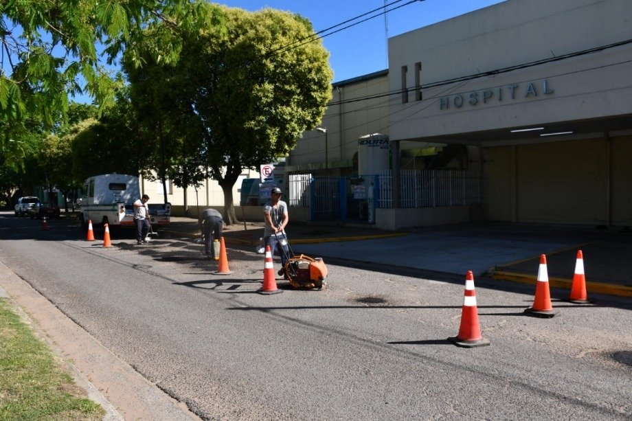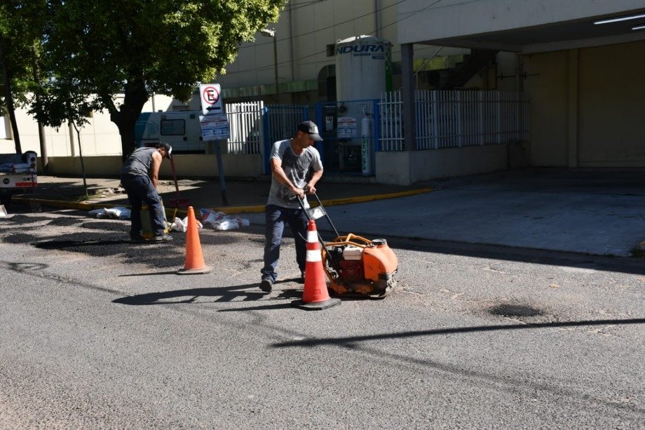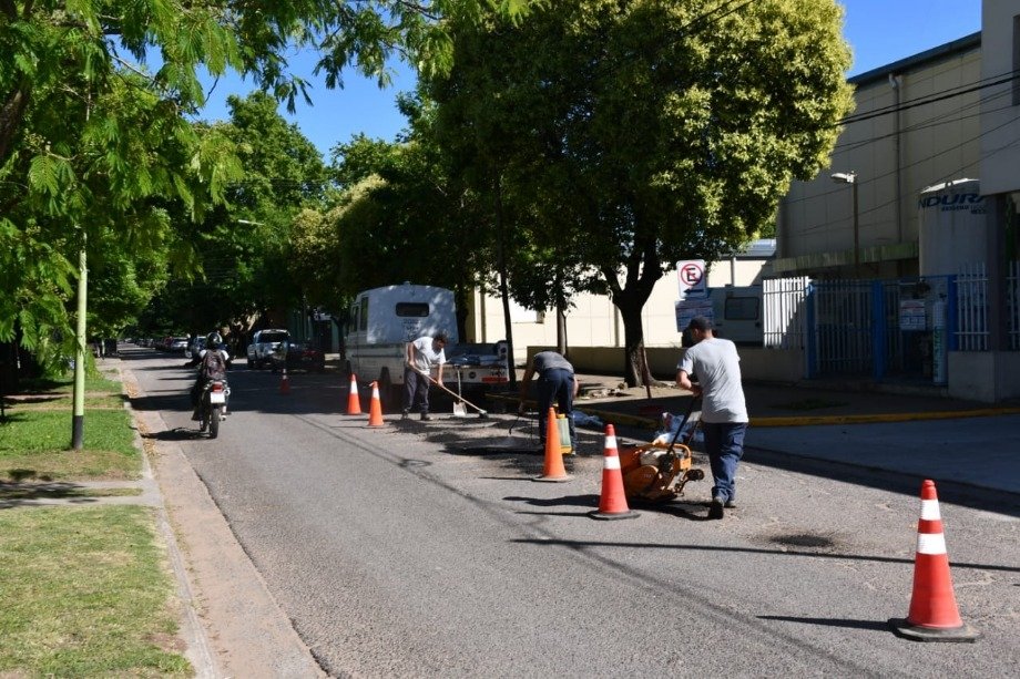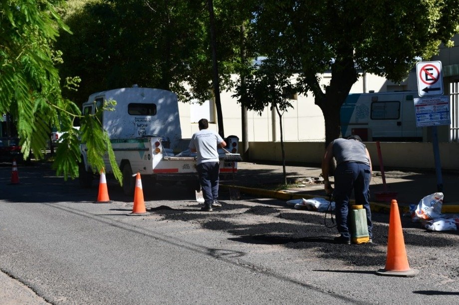Personal municipal estuvo realizando trabajos de bacheo y mantenimiento en la Avenida Bozan, intersección con la calle Estrada.