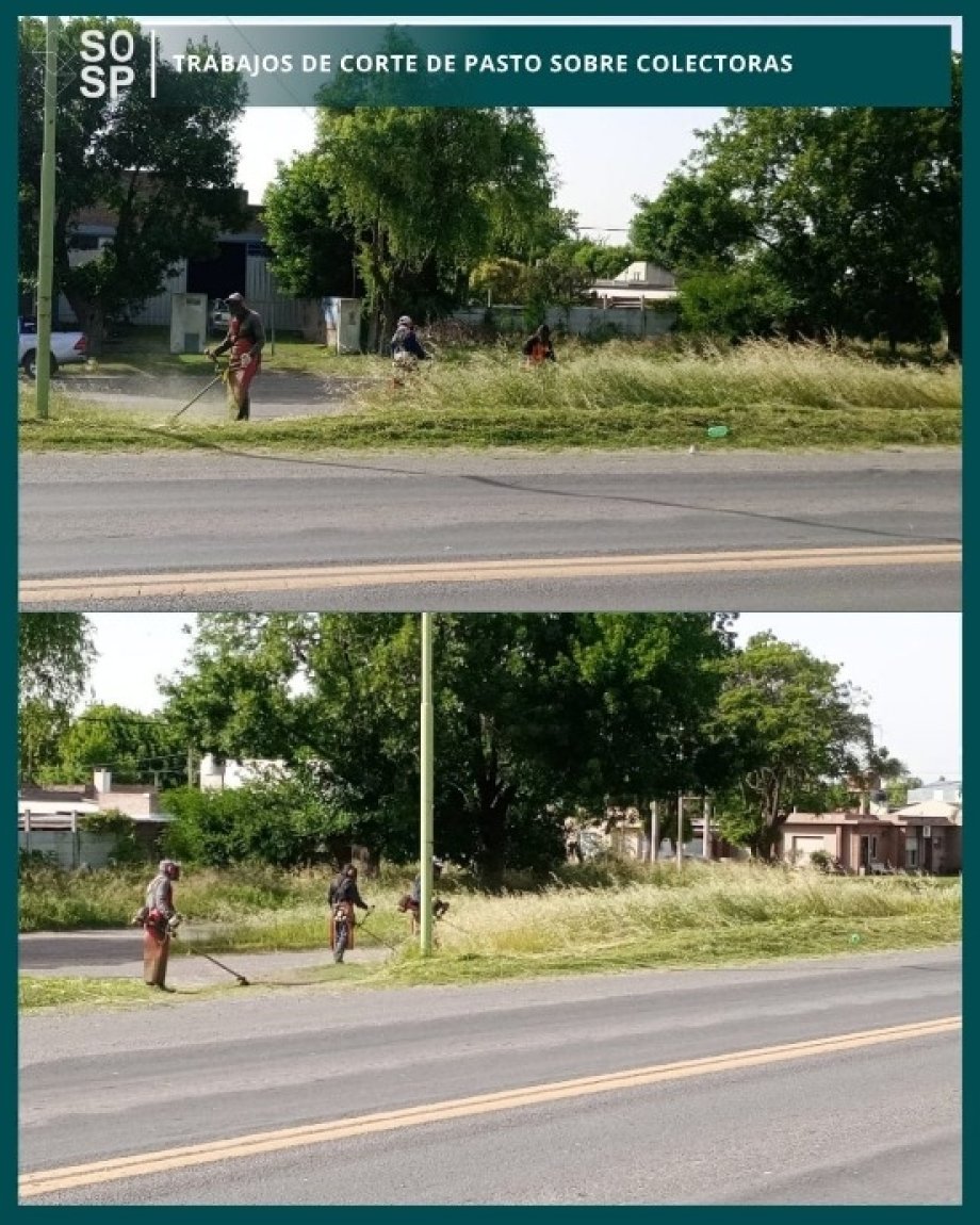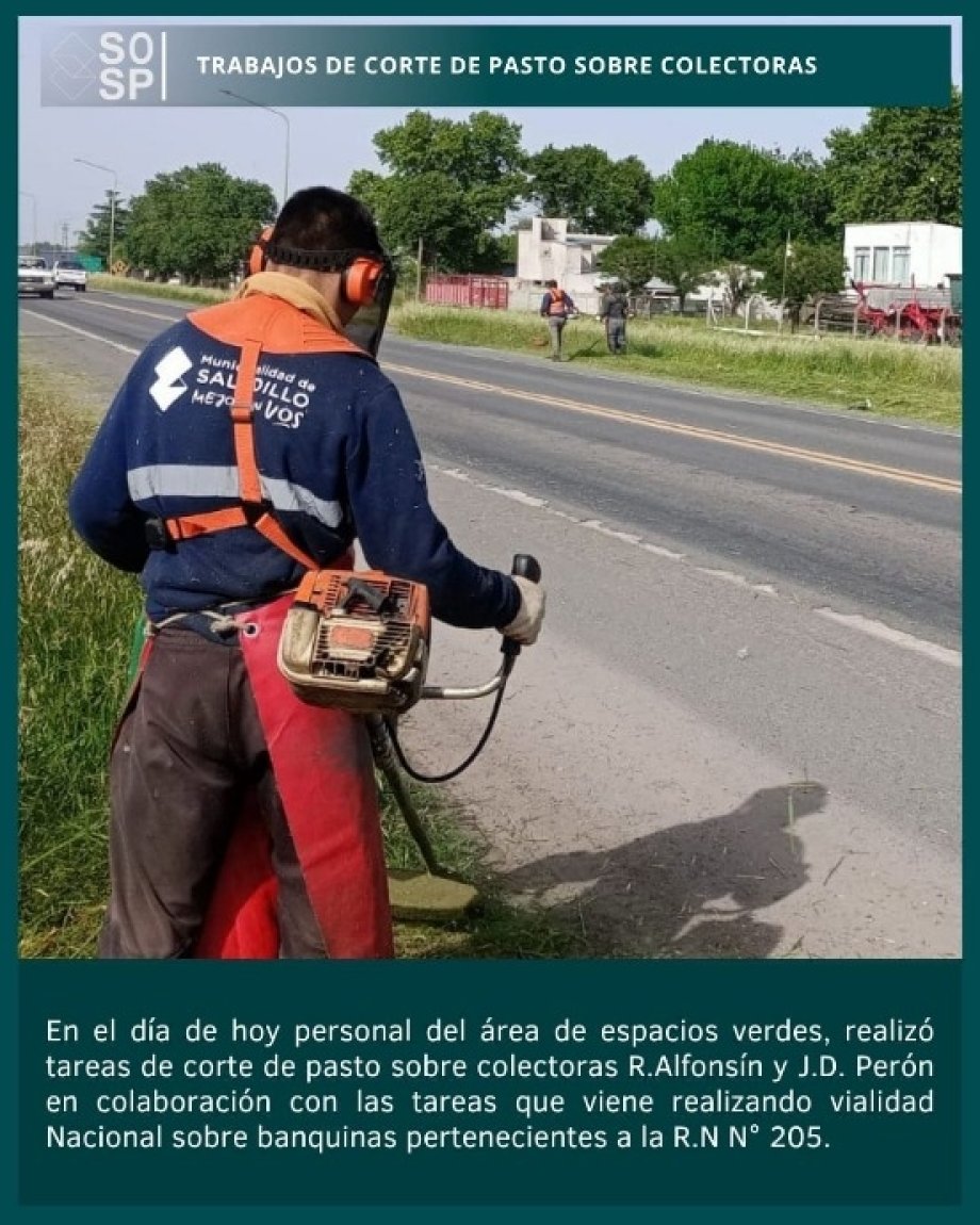 En el día de hoy personal del área de espacios verdes, realizó tareas de corte de pasto sobre colectoras R.Alfonsín y J.D. Perón en colaboración con las tareas que viene realizando vialidad Nacional sobre banquinas pertenecientes a la R.N N° 205.