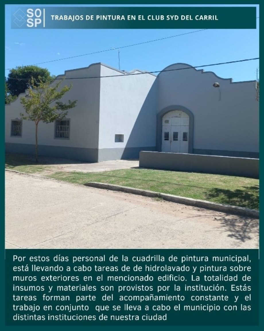 Por estos días personal de la cuadrilla de pintura municipal, está llevando a cabo tareas de de hidrolavado y pintura sobre muros exteriores en el mencionado edificio. La totalidad de insumos y materiales son provistos por la institución. Estás tareas forman parte del acompañamiento constante y el trabajo en conjunto que se lleva a cabo el municipio con las distintas instituciones de nuestra ciudad