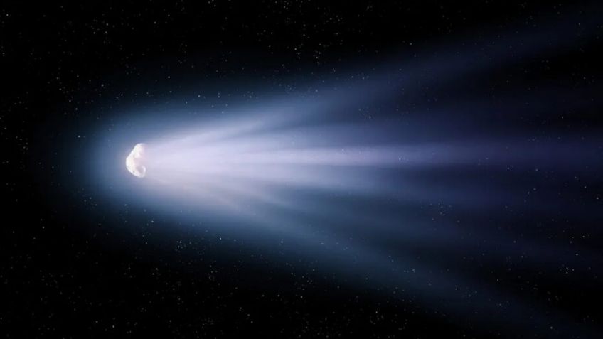 Cuando un cometa se acerca al Sol, el hielo que contiene su núcleo pasa al estado gaseoso y suelta una larga cola que refleja la luz del astro rey.