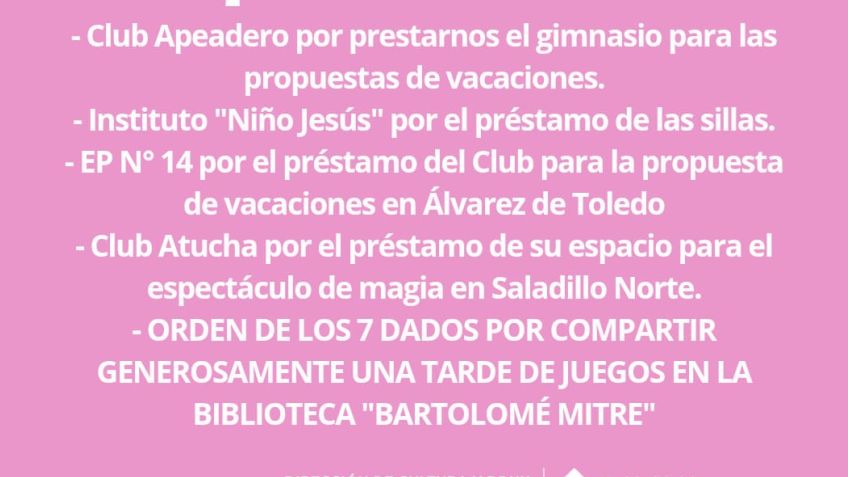 - Club Atucha por el préstamo de su espacio para el espectáculo de magia en Saladillo Norte.