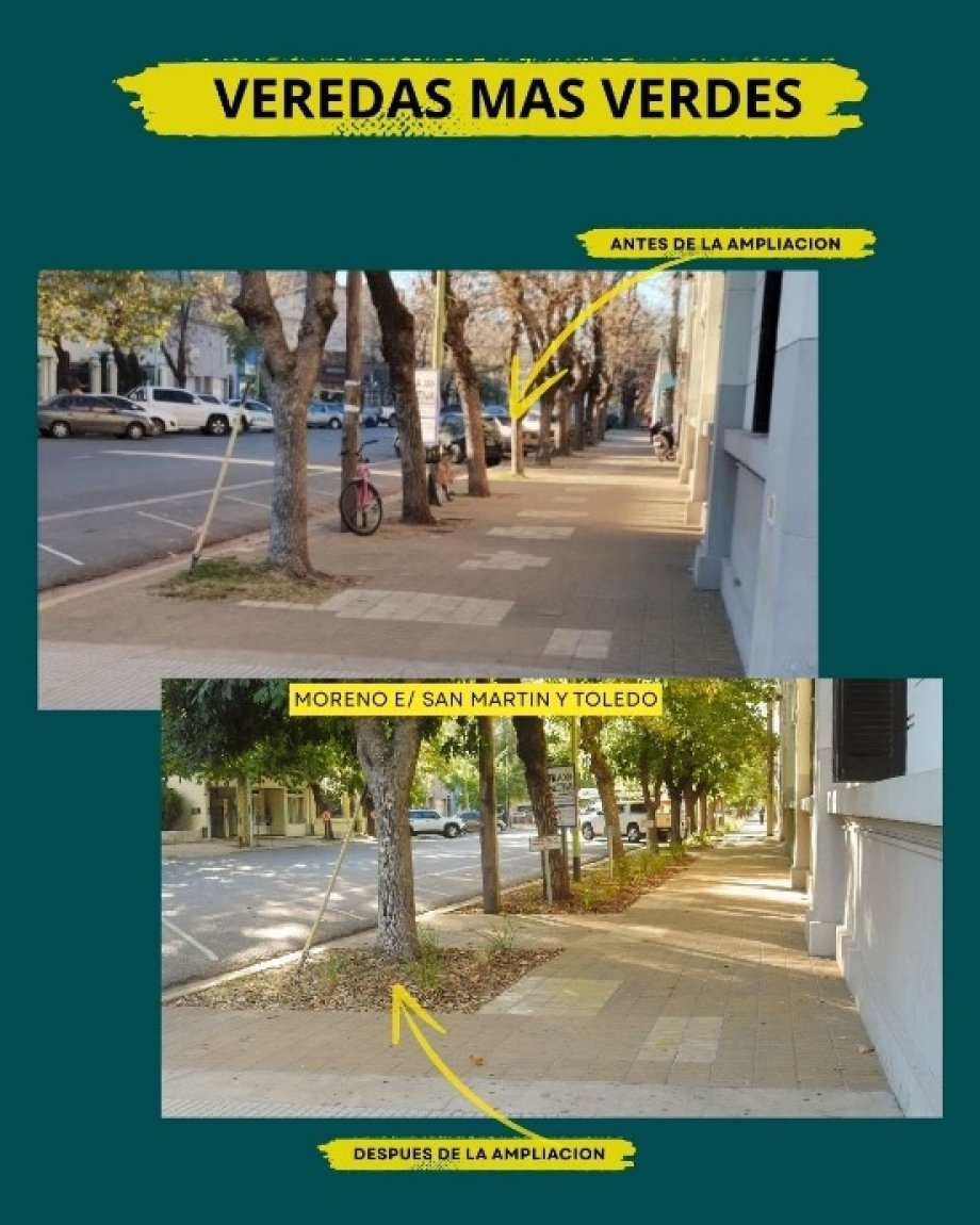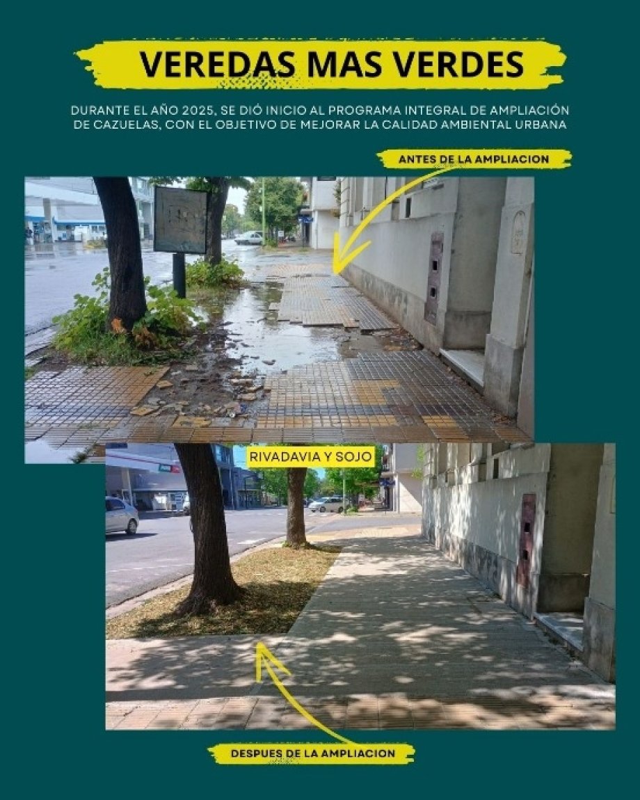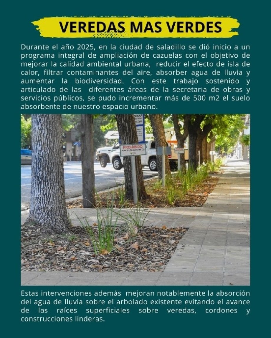 Durante el año 2025, en la ciudad de saladillo se dió inicio a un programa integral de ampliación de cazuelas con el objetivo de mejorar la calidad ambiental urbana, reducir el efecto de isla de calor, filtrar contaminantes del aire, absorber agua de lluvia y aumentar la biodiversidad. Con este trabajo sostenido y articulado de las diferentes áreas de la secretaria de obras y servicios públicos, se pudo incrementar más de 500 m2 el suelo absorbente de nuestro espacio urbano.