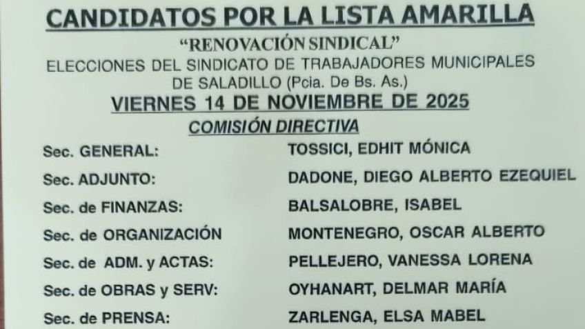 La Lista Celeste, encabezada por Celia Estela Díaz y la Lista Amarilla "Renovación Sindical, encabezada por Edith Mónica Tossici, competirán el próximo viernes 14 de noviembre para la elección de autoridades del Sindicato de Trabajadores Municipales en nuestra ciudad. El acto eleccionario se desarrollará en la sede del Sindicato, en la calle Hipólito Yrigoyen, entre avenida Belgrano y 12 de Octubre, entre las 08:00 y las 18:00.