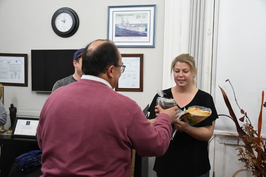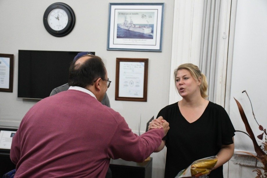La periodista y su pareja fueron recibidos por el Intendente José Luis Salomón, el Secretario de Desarrollo Local, Vladimir Wuiovich, el Jefe de Gabinete, Ezequiel Tarabú y el subsecretario de Desarrollo, Tomás Chaime por parte de la Municipalidad y Eber Andriuolo en representación de la Cervecería Lindenberg.