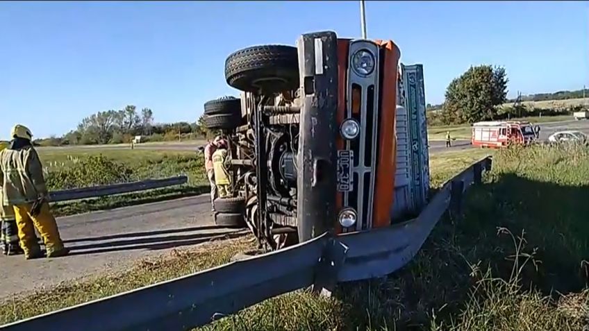 Por causas que se desconocen, volcó esta mañana en la subida del puente distribuidor, un camión Ford 350, patente UOG 370, que volvía del Frigorífico de San Miguel del Monte con carga de pollos y carne.